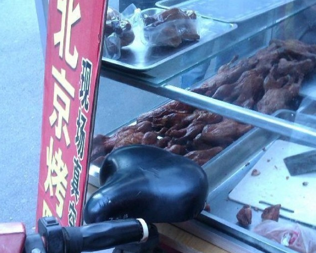 4月8日,記者對北京西站等地的烤鴨市場進行了暗訪。北京西站旁的北蜂窩西路上,一個流動攤販的推車前掛著“北京烤鴨25元/只”的牌子。推車的玻璃柜里陳列著20多個烤好的鴨子,玻璃柜上方還放著已經包裝好的“全聚德”和“金聚!钡目绝,旁邊還有幾個全聚德烤鴨的包裝袋。