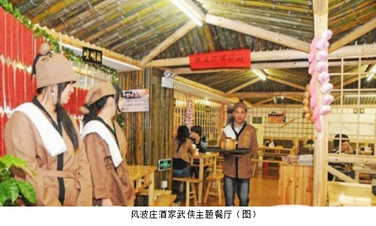 在這家餐廳,筷子不叫筷子,叫雙節(jié)棍。顧客是大俠,點(diǎn)菜得找莊主。這餐廳裝璜其實(shí)非常簡(jiǎn)陋,不過(guò)因?yàn)橛袆?chuàng)意,生意倒是天天滿座。