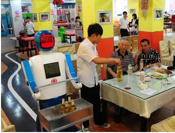昨日,一家機器人主題餐廳在哈爾濱市中央大街開業。它們長相色彩各異,個頭1.31.6米不等,可以呈現10多種面部表情,會講簡單語句。為防止碰撞客人,每個送餐機器人都裝有超聲波探測裝置進行避障。