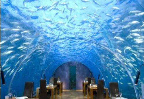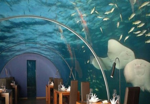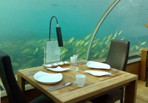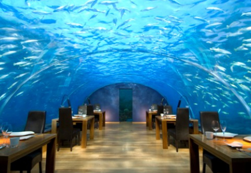 馬爾代夫港麗度假開設的第一個全玻璃海底餐廳。該餐廳為了慶祝他們的周年紀念而建,為客人也提供了體驗機會,不僅吃海下的,還在海下吃,睡在海下。真的是不可思議。意境也不用說了,是多么壯麗。