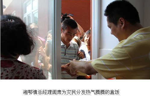 湘鄂情總經(jīng)理?肅親自帶著配餐車,趕到救災(zāi)現(xiàn)場,向群眾分發(fā)盒飯。他表示,湘鄂情做為首家在A股上市的民營餐飲企業(yè),向?yàn)?zāi)區(qū)人民奉獻(xiàn)愛心,是履行上市公司的企業(yè)社會(huì)責(zé)任,投身社會(huì)公益事業(yè)將是湘鄂情堅(jiān)守的核心價(jià)值和長遠(yuǎn)追求。