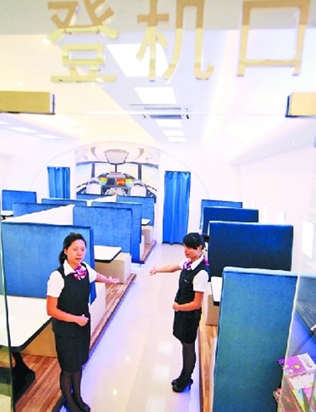 “歡迎登機!”一進入餐廳,你就能看到服務員彎著腰,做出歡迎的手勢。“我們的服務員都是參考空姐的標準來招收,要求身高160cm以上,長相清秀,笑容甜美等。”黃慧玲介紹說,服務員統(tǒng)一著空姐制服,上班前還得接受餐飲禮儀和空姐服務方面的培訓。