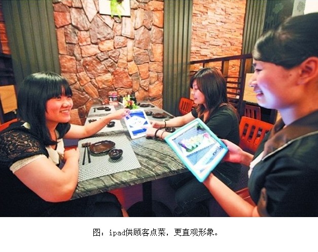 到餐廳吃飯,首先要做的就是點菜。傳統(tǒng)的點菜方式都是服務員拿著一本菜單,供顧客選取菜樣,再把菜樣填在一張單上。T淘園內的一家日本料理店卻別出心裁,使用ipad供顧客點菜。