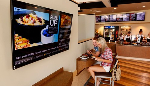 通過數(shù)字標牌系統(tǒng)的構(gòu)建,餐廳就可以把主打菜品通過大屏幕靈活生動的展現(xiàn)出來,試問在“跟著感覺走”的點餐過程中,顧客怎么會對大屏幕顯示中播放的熱騰騰、香噴噴的美味佳肴視而不見呢?而且,店內(nèi)的數(shù)字標牌網(wǎng)絡還可與時下熱門的社交媒體,如微博、微信等,打造出美食討論圈,對顧客發(fā)布的相關(guān)美食信息、餐廳評論實時追蹤、展示,讓餐廳與“微博控”、“微信控”們保持互動,從而對顧客消費習慣進行輿論引導,提高菜品的推廣效率。