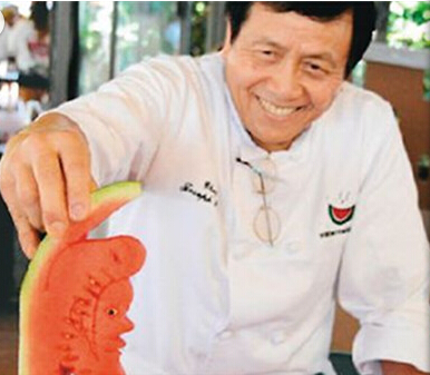 在整個西瓜節上最引人注目的是雕西瓜活動,廚師們紛紛大展雕工,而華裔廚師潘國強最受注目。兩周前剛剛在一個60萬廚師參加的美國廚師比賽上獲得2014年度廚師稱號的潘國強,是歷史上唯一獲得此獎項的華裔廚師。在他的刀下,各種造型被雕刻得栩栩如生,從熱帶魚到中國龍,從玫瑰花到小兔子,快的時候只用20秒就可以雕出讓人驚嘆的西瓜藝術品。