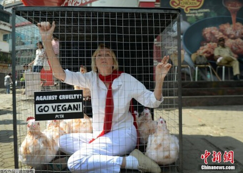 當地時間2014年11月6日,印度孟買,印度善待動物組織(PETA)的成員Ingrid E. Newkirk將自己關在籠子里面,在一家肯德基外抗議其虐殺動物的不當行為。